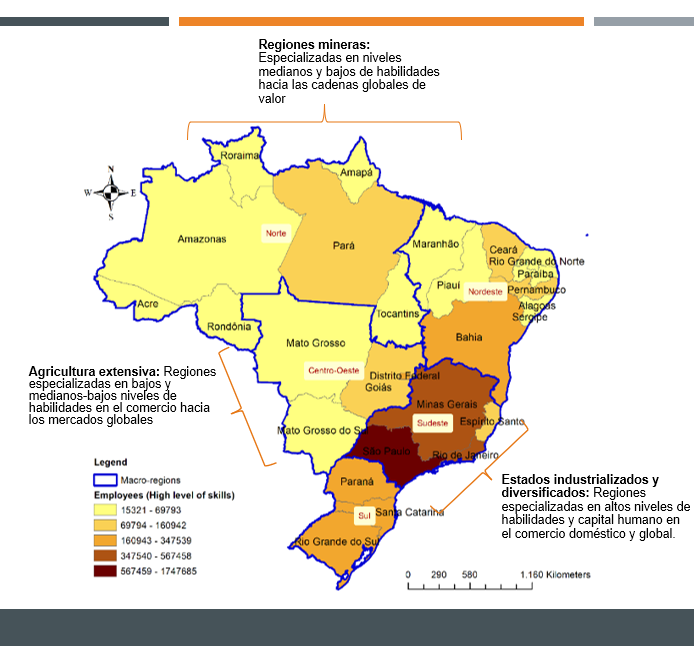 Por otro lado, señaló que se ha identificado que las economías centrales, más industrializadas y diversificadas, ubicadas en los grandes centros urbanos de São Paulo y Río de Janeiro se especializan en etapas a lo largo de la cadena de valor, con alto grado de habilidades del trabajo implícitamente incorporados al comercio.