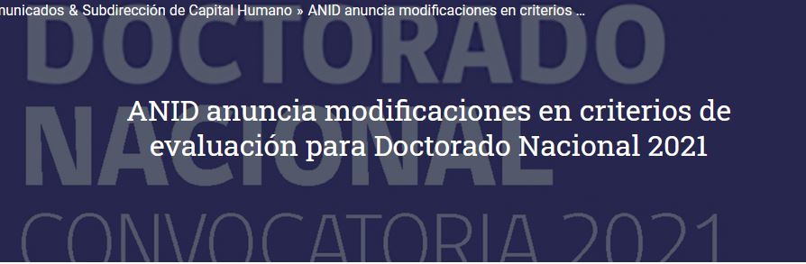 1 diciembre, 2020 Paola Segovia Escuela ANID anuncia modificaciones en criterios de evaluación para Doctorado Nacional 2021 Con el propósito de contribuir a una mayor equidad entre quienes postulan a los instrumentos para financiar su formación de postgrado, la Agencia Leer mas